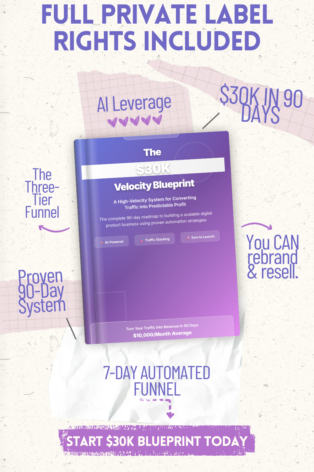 - Legal Disclaimers (Required Reading)Income Disclaimer: The examples and financial figures mentioned in this sales copy and within the $30K Velocity Blueprint are based on potential earnings and are not a guarantee of future success. Your ability to generate income is dependent upon your individual effort, execution of the strategies outlined, business acumen, and market conditions. This product is for educational and informational purposes only. You agree that we are not responsible for any financial decisions or results you may experience from using this material.Refund Policy Disclaimer: Due to the nature of digital goods and the immediate granting of Private Label Rights (PLR) for commercial use, all sales are final. We cannot accept returns or issue refunds once the product files have been downloaded. By completing your purchase, you acknowledge and agree that you are receiving a high-value, immediately usable, non-returnable asset, and you accept this No Refund policy.